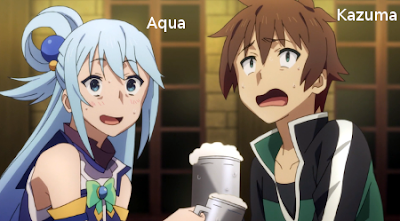Kazuma Satou é tudo o que um herói clássico não poderia ser: Malandro, astuto, hentai, um pouco traiçoeiro e desesperado com a pobreza e suas dívidas que só crescem, além disso ele tem muito pouca sorte e recruta, contra a própria vontade, três amigas pouco comuns. Aqua é uma deusa rebaixada que ele trouxe para seu novo mundo contra a vontade dela. Tendo a opção de pedir o que quisesse, Kazuma desejou que ela o acompanhasse como vingança por ter zoado do modo ridículo como ele morreu. Aqua por ser uma deusa destituída de seu cargo é convencida, orgulhosa, chorona, cheia de caprichos, inconsequente, de pouca inteligência, bebe igual um motor V8 e não importa de que forma você olhe ela parece não está usando calcinha. Nosso amigo ainda acaba se juntando a Megumin, uma maga treinada em magias de explosão que se recusa a aprender qualquer outro tipo de poder mesmo que isso a torne inútil para uma equipe. E por fim a minha preferida, Darkness, uma cavaleira masoquista cujo maior prazer é ser maltratada e esbofeteada durante as batalhas escolhendo ela mesma, para desespero de Kazuma, se meter em situações perigosas.